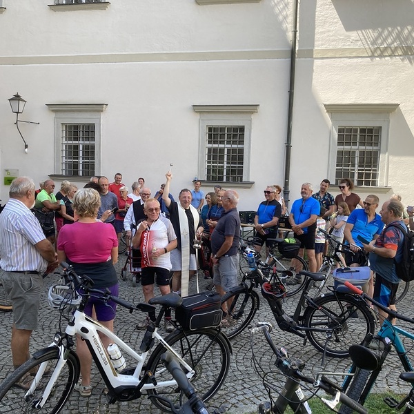 An die 100 RadfahrerInnen aus Wartberg und Nußbach - aber auch von weit über die Pfarrgrenzen hinaus - waren der Einladung der KMB nach Schlierbach in den Stiftshof gefolgt um für sich und sein Fahrrad um Segen und Schutz zu bitten.