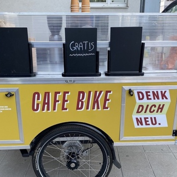 Am 20.Juni nachmittags machte das "Cafe-bike" Halt beim Parkplatz vorm Kaufhaus  Greul  und lud alle Vorbeikommenden auf einen Becher Kaffee und zum Austausch mit unseren Jugendpastoralbeauftragten ein.