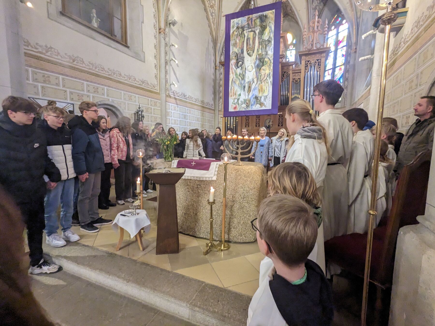 Alle Kinder und Jungscharkinder waren beim Abschlusssegen voll in “action” rund um den Altar dabei. Beim sogenannten Mitmachsegen baten wir um Gottes Segen, speziell auch für den anschließenden Jungscharausflug ins Jump Dome - damit alle Knochen heil blieben!