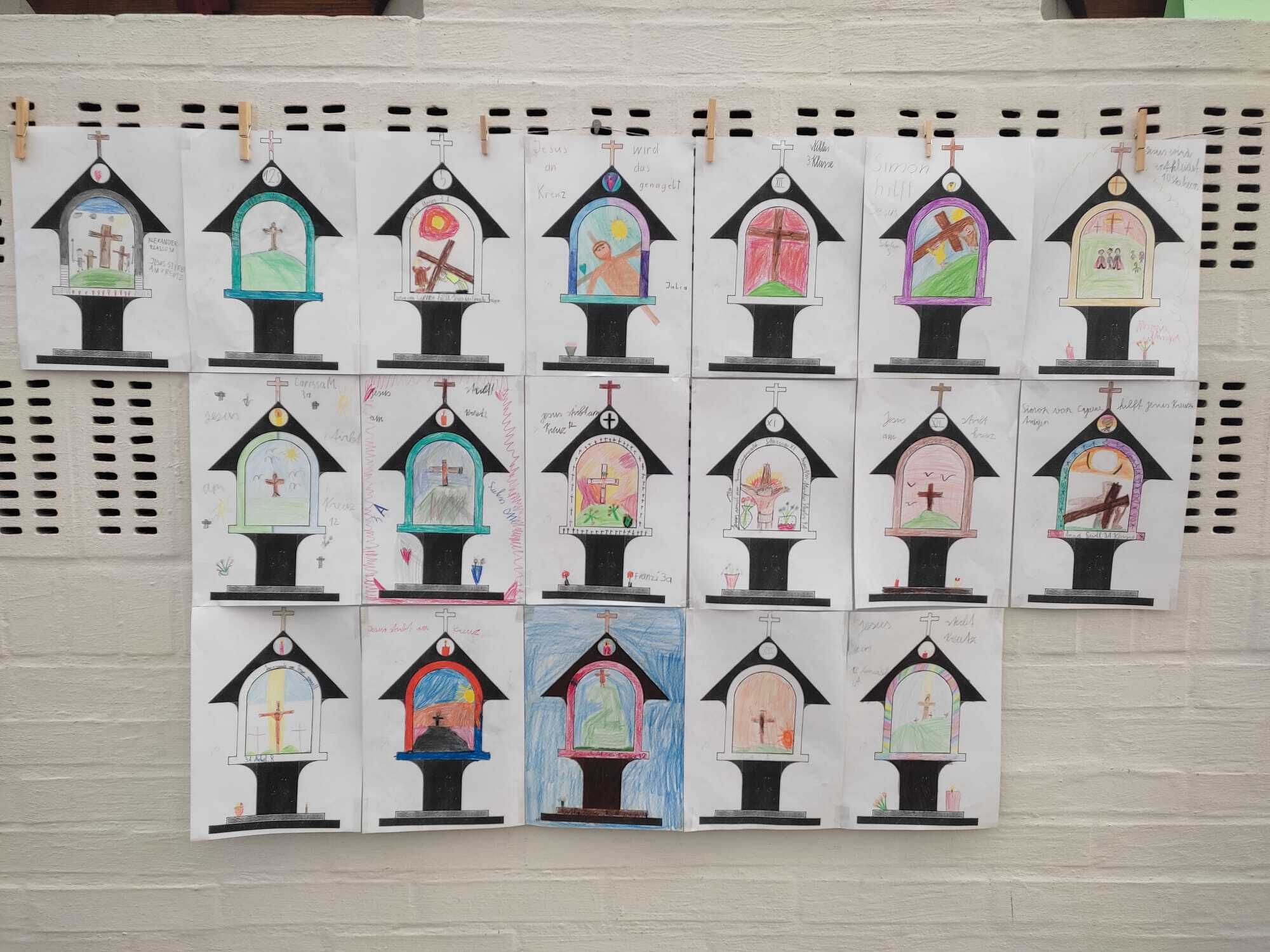 Kinder gestalten Kreuzweg Die Kinder der 3. Klasse Volksschule Seewalchen gestalteten mit ihrer Religionslehrerin Maria Six einen gezeichneten Kreuzweg. Das Kunstwerk kann in der Pfarrkirche besichtigt werden. Schöne Aktion! mehr: Kinder gestalten Kreuzweg